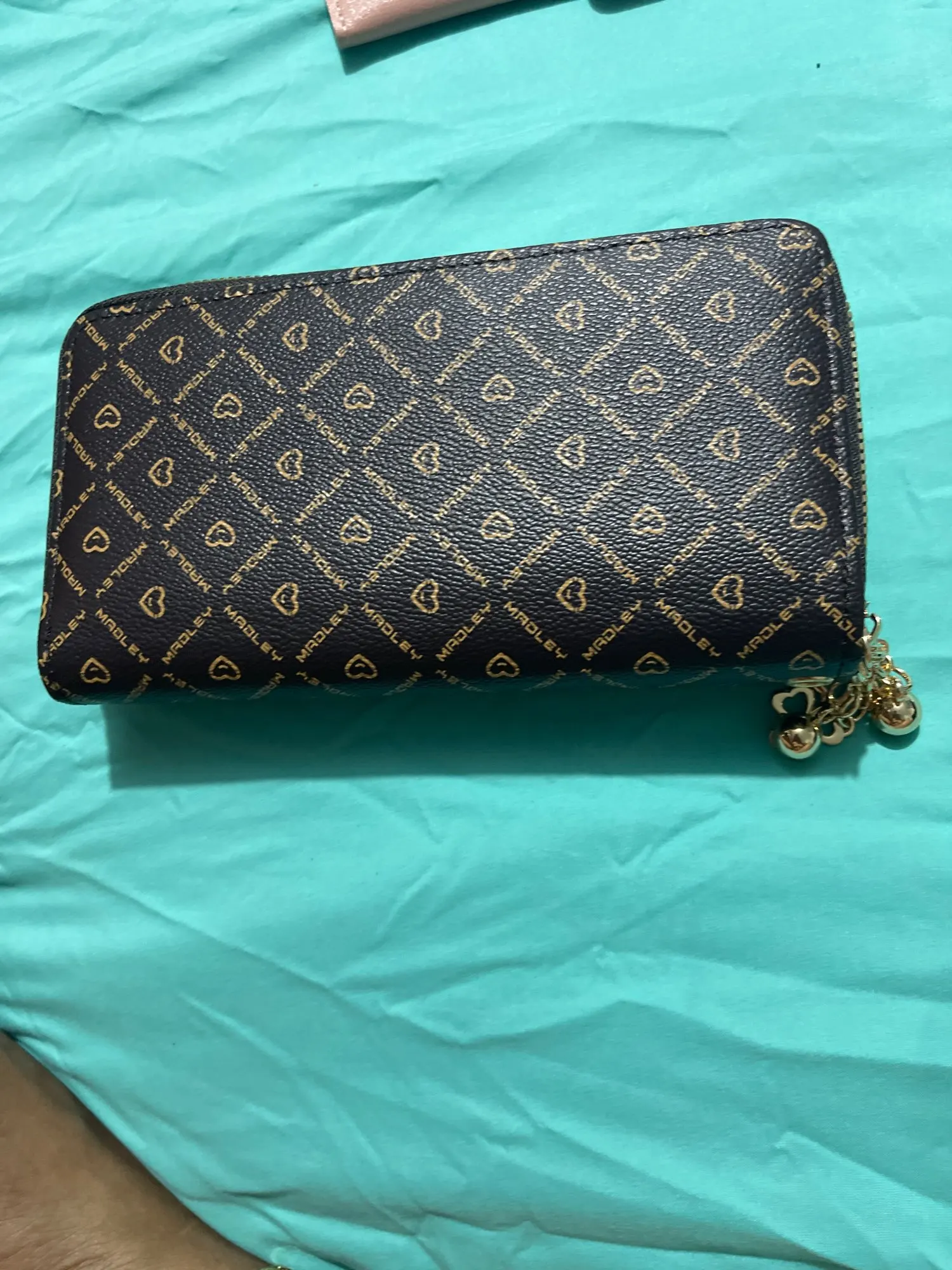 Le motif à cœurs répétés sur l’ensemble de la surface contraste joliment avec la couleur brune profonde du revêtement extérieur, apportant un jeu graphique raffiné. La dragonne amovible, assortie au reste du modèle, permet un port à la main confortable lors de vos sorties ou déplacements.